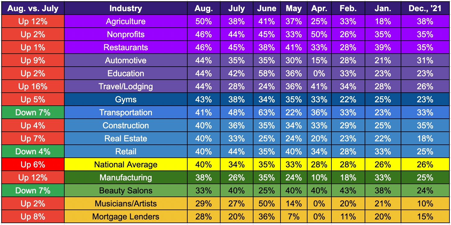 - Beauty Salons (dipping 7% from 40% in July to 33% in August).
