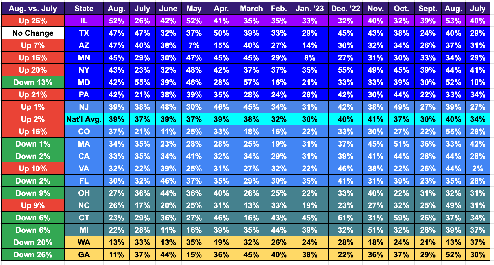 But several other larger states are in the Top 10 when it comes to SMB rent delinquency rates, a few with major surges from July (in bold), too: