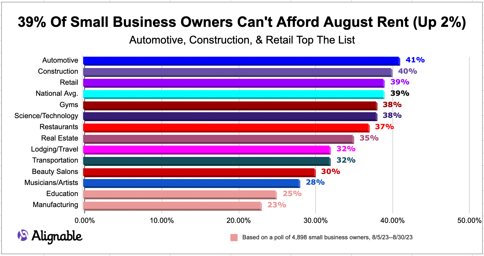 Given the ongoing struggles small businesses are having in generating more revenues this summer, it's also not a surprise that 39% couldn't afford to pay their rent in full and on time in August, tying April and June for 2023's U.S. small business rent delinquency record.