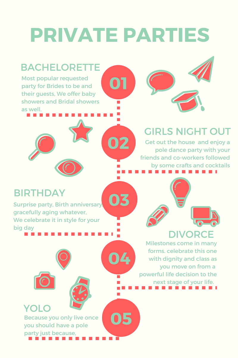We specialize in parties of 3 or more who want to celebrate a special occasion trying something a little unconventional. A Pole Party is a great team builder for corporations, Family members who you don't visit with too often, or close friends you haven't hung out with since childhood. Call or email to inquire about A 2 hour party of 5.