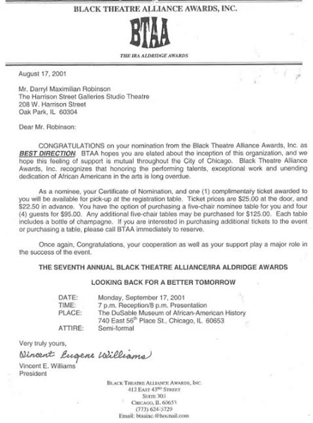 Your humble servant only recently became aware of Mr. Williams' passing, but is happy to be one of many who salute his longtime commitment to honoring the contributions of African-American Artists to The Greater Chicago Professional Theatre Community.