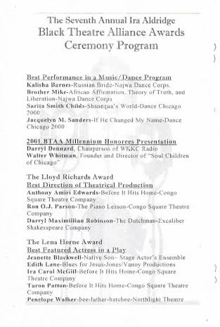 Every year at this time ( usually mid-August ) I am always delighted to read the list of local Windy City African-American talents who have been honored with The Annual Black Theatre Alliance / Ira Aldridge Awards nominations as well as Special Recognition Honors provided by a well-versed performing arts BTAA Judging Committee and the BTAA's President and Founder, the irrepressible and always enthusiastic Mr. Vincent E. Williams.
